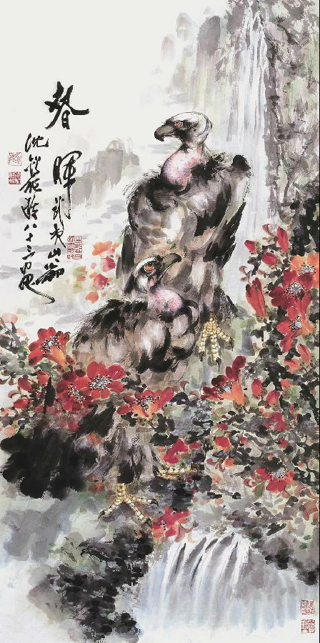 画于83岁的《春晖》,精细之处体现画家超人的眼力、体力。秃鹫的丝丝绒毛,后颈皮肤的柔韧、爪子的锋利、鹰喙的坚硬、眼睛的灵动刻画得细致深入,画面繁复而笔笔精到,83岁的老人这样作画,其超人的充沛精力令人佩服。而另一类作品,如80岁画的梅兰竹菊四条屏,《武夷幽兰》等作品,形意饱满,雄浑劲健,豪放气盛。